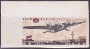 1 руб. Самолёт АНТ-14 над Ленинградом. Вырезана из блока. 1 марка c полем.