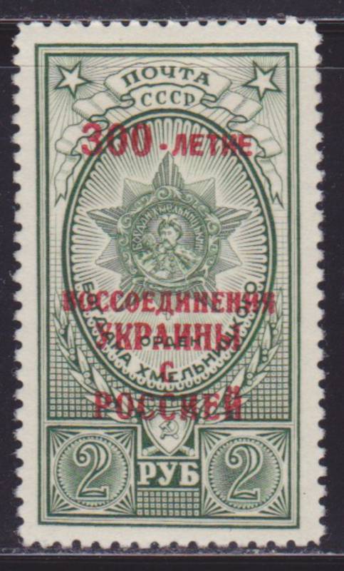 Красная надпечатка " 300-летие Воссоединение Украины с Россией ". 1 марка.