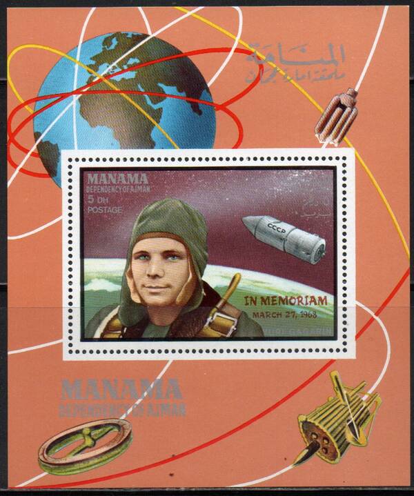5 Dh. Год со дня гибели Юрия Гагарина. Красная надпечатка "... MARCH 27 1968". Блок.