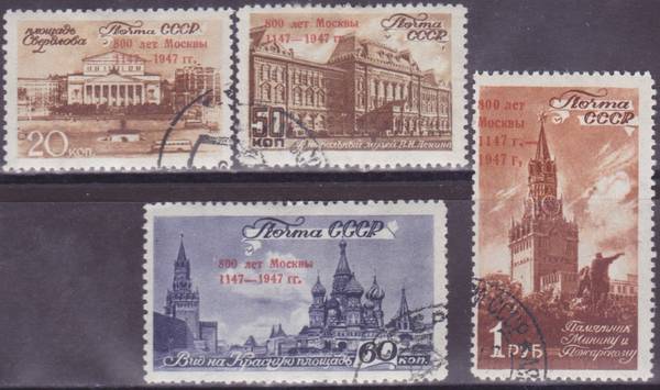 Красная типографская надпечатка в две строки " 800 лет Москвы 1147 г. - 1947 г. ". С клеем.