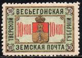 Весьегонский уезд, 10 коп. Чёрная, зелёная, красная и золотая. 1 марка.