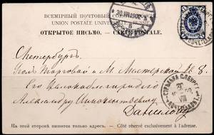Штемпель прибытия: "С.-Петербург 30 VIII 1902 ЭКСП ГОР ПОЧТ 5 ".