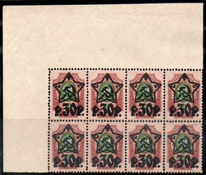 Литографская Надпечатка Звезды и "Р. 30 Р." на 50 коп. Угловой восьмиблок.