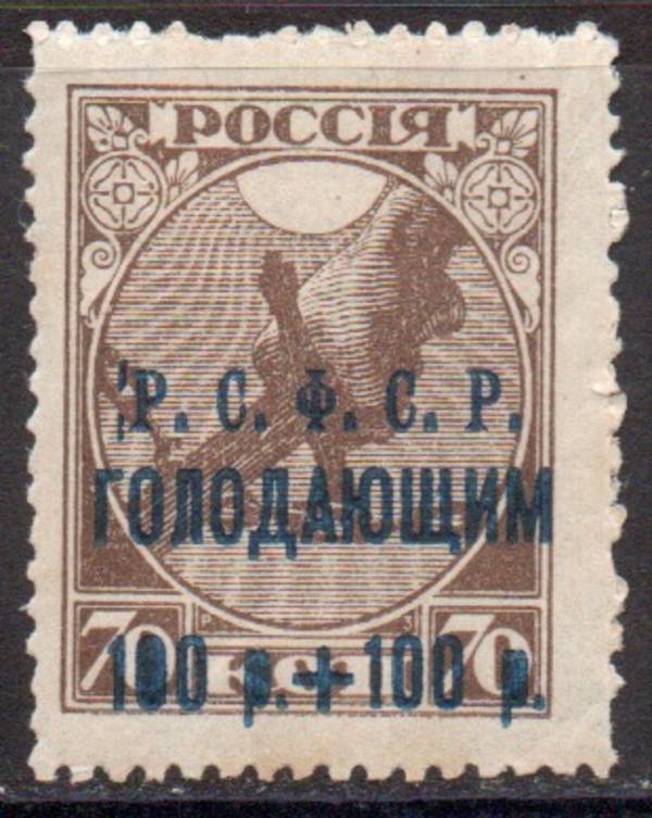 Черточки перед "Р" в "Р.С.Ф.С.Р." в синей надпечатка на 70 коп. 1 марка.
