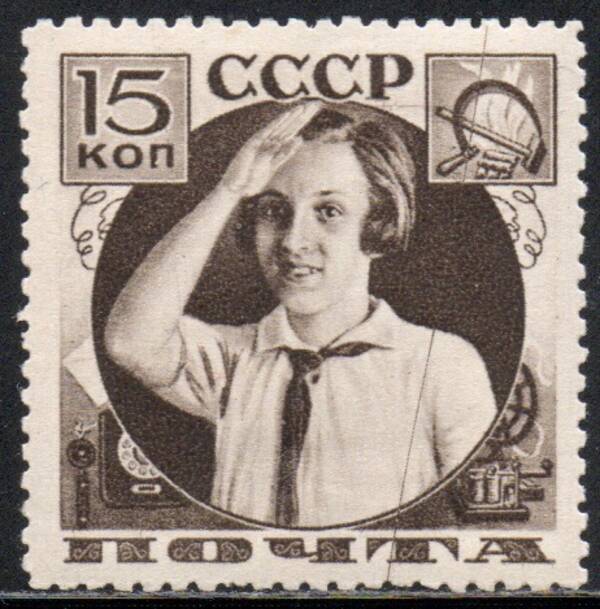 15 коп. Коричневая. Пионерский Салют. Черта пересекает всю марку по вертикали. 1 марка.