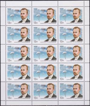 100 лет испытанию ранцевого парашюта. Изобретатель Г.Е.Котельников. Лист марок.