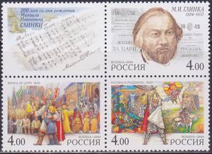 200 лет со дня рождения М.И.Глинки ( 1804-1857 ). Сцепка из 3-х марок + купон.