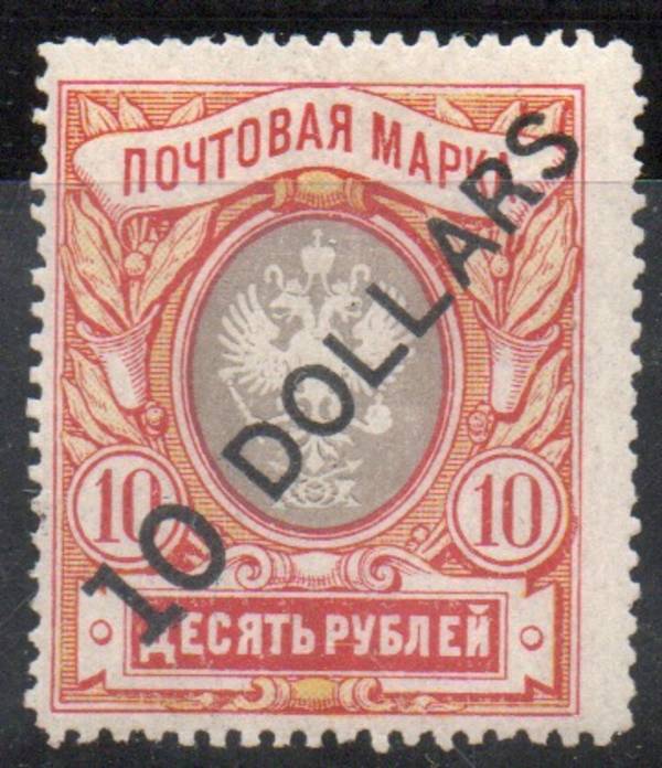 Чёрная типографская надпечатка "10 DOLLARS" на 10 рублях ( марка № 106 Российской Империи ). С клеем.