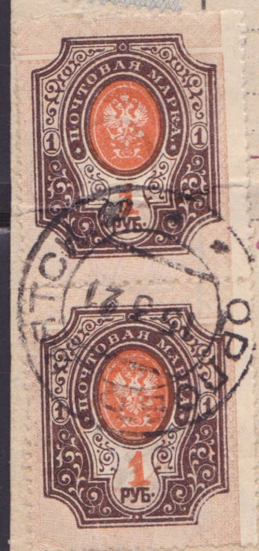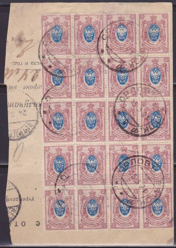 Заказной Сопроводительный Адрес к Посылке. Франкирован марками 15 коп. ( 20 шт. ) - несколько марок со сдвинутыми центрами, 20 коп. ( 1909-17 гг. ) и 1 руб. ( 1916 года ) - пара с сильным сдвигом фона. |
