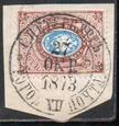 10 коп. за лот. Коричневая / синяя. Штемпель "Санкт-Петербург 27 ОКТ. 1873". 1 марка на вырезке.