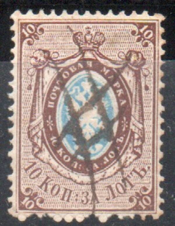 10 коп. за лот. Коричневая/ синяя. Водяной Знак " 1 " ( виден в сигноскоп ). Перф. Рам. 14 1/2 : 14 3/4. Толстая бумага - 0,11 мм. Погашена росчеком пера. Хорошая сохранность. |