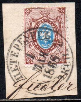 10 коп. за лот. Коричневая / синяя. Штемпель "Санкт-Петербург 4 МАЯ 1868". 1 марка на вырезке.