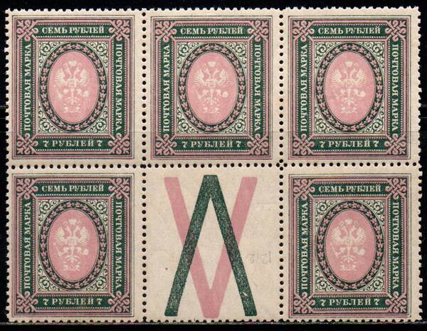 7 рублей. Тёмно-зелёная / Розовая. Перф. Лин. 12 1/2. Шестиблок с Контрольным Знаком.