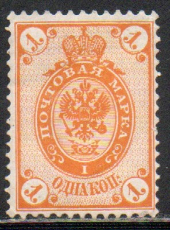 1 коп. Оранжевая, яркий фон. Типография. " со стрелками ". Горизонтальный водяной знак. Перф. Рам. 14 : 14 1/2.