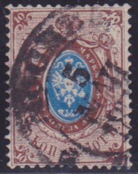 Типография, вертикальный водяной знак. Перф. Рам. 14 1/2 : 15. Календарный штемпель " Москва 5 мая 187... ". Разбит рисунок в правом верхнем углу.