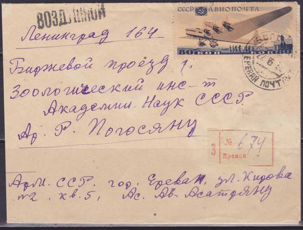 Письмо Франкировано маркой 80 коп. АНТ-20 ( "Максим Горький" ). Отправлено из Еревана 22 мая 1938 и прибыло в Ленинград 24 мая 1938 года. На отправлено имя академика Ар.Р. Погосяна. |