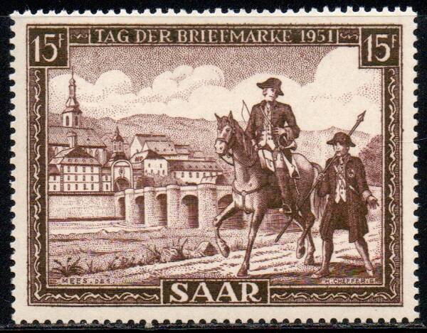Почтальон на лошади и пешком (ок.1760 года). Старый мост и церковь, Саарбрюккен. 1 марка.