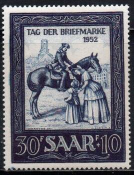 Почтальон на лошади и мать с ребенком. 1 марка.