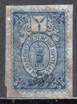 Типография на тонкой белой бумаге. ЭЗГБ. Клей белый. Без зубцов. Под гербом дата "1874".