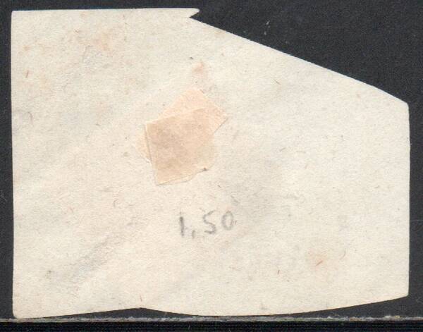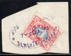 Двухцветная литография на белой бумаге. Перф. Лин. 11 1/2. Вырезка из конверта. Погашена фиолетовым штемпелем: "Шадринская уездная 7- дека 1890". |