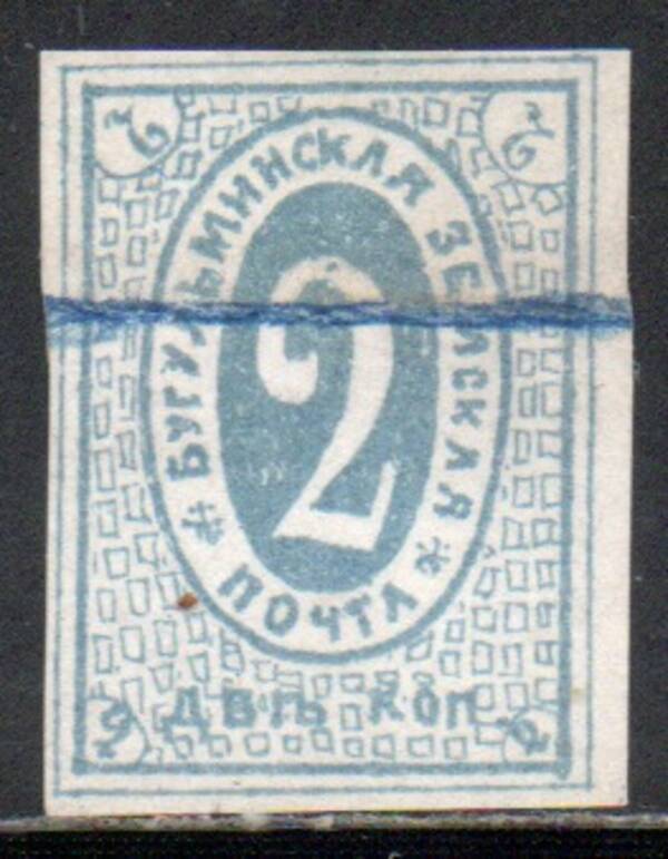 2 коп. голубая. Литография на белой бумаге. Без зубцов. Погашена перечёркиванием.