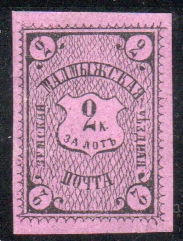Малмыжский уезд 2 коп. чёрная на лилово-розовой бумаге. 1 марка.