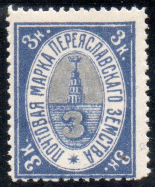 Переяславский уезд 3 коп. тёмно-синяя. Серебряная краска центра и номинала. 1 марка.