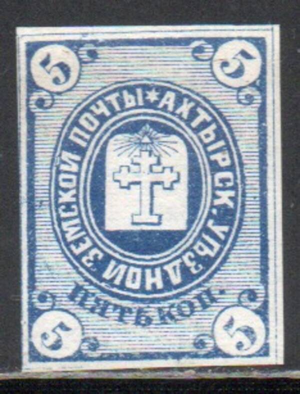 Ахтырский уезд 5 коп. Тёмно-синяя на белой бумаге. 1 марка.