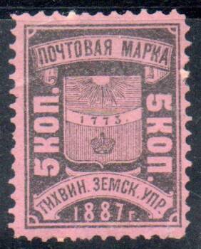 Тихвинский уезд 5 коп. чёрная на розовой бумаге. 1 марка.