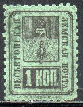 Весьегонский уезд, 1 коп. чёрная на серовато-кремовой бумаге. 1 марка