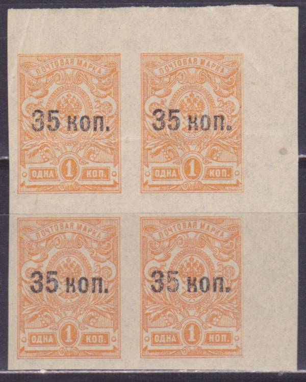 Чёрная типографская надпечатка "35 коп." на марке № 111 Российской Империи. Угловой квартлок. Свой клей.