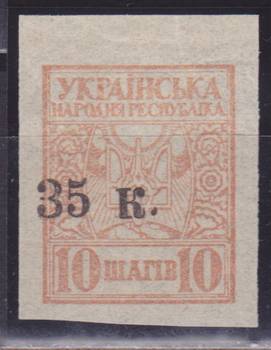 Чёрная типографская надпечатка: " 35 к. " на марке Центральной Рады 10 шагив.