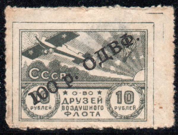 Чёрная типографская надпечатка на марке 10 рублей "О-во Друзей Воздушного Флота". Небольшое тонкое место.