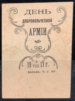 ДЕНЬ Добровольческой АРМИИ 9 VIII 1917 г. Казань. Т. Г. ПР. 1 марка.