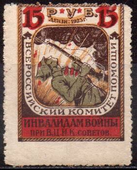 15 руб. Инвалидам Войны при В.Ц.И.К. Советов. Абкляч. 1 марка.