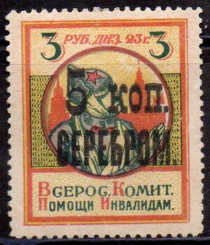 Типографская надпечатка: "5 к. серебром" на 3 руб. ВСЕРОС. КОМИТ. Помощи Инвалидам. Свой клей.