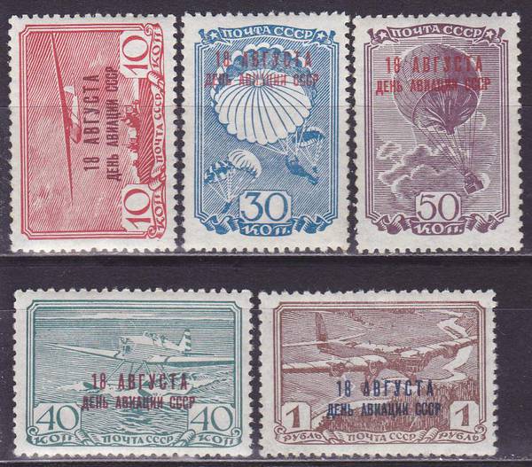 Красная типографская надпечатка на марках 1938 года в изменённых цветах. Свой клей.