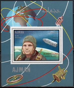 5 Dh. Год со дня гибели Юрия Гагарина. Красная надпечатка "... MARCH 27 1968". Блок.