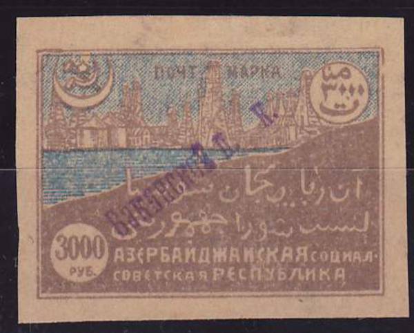 Надпечатка заверения переоценки " БАКИНСКОЙ П.К." на марке 3000 руб. "Нефтепромыслы". Без зубцов. Выпускались без клея.