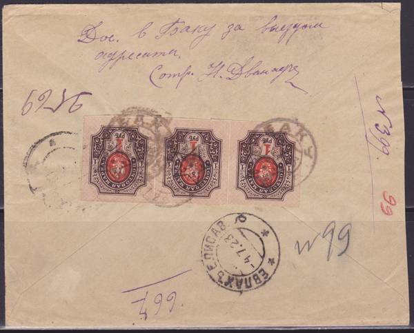 Заказное Почтовое Отправление. Штемпель " Баку 1.07.1923 * в * ". Штемпель прибытия " Евлахъ Елисав. -4.07.1923 д * * ". Рукописные надписи " Дос. в Баку за выездом адресата. Сотр. " и подпись. |