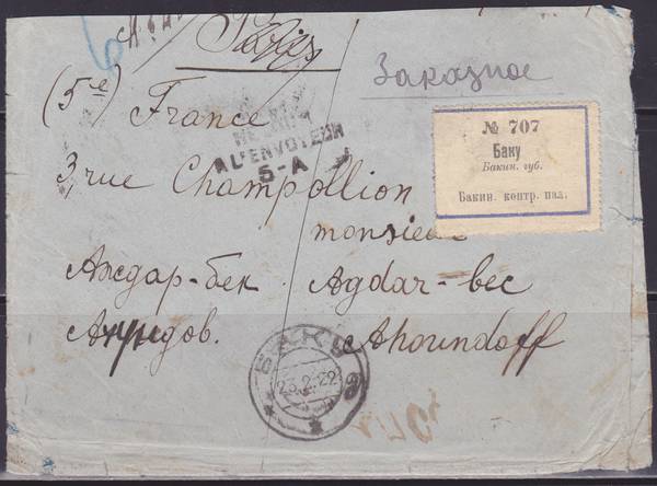 Заказное Почтовое Отправление: Баку - Париж. Франкировано марками " Бакинской П.К ".