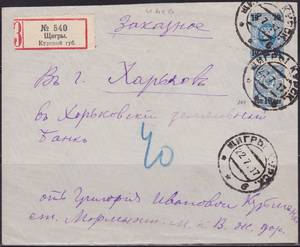 Размер 144х120. Заказное почтовое отправление: Щигры 22.07.1917. - Харьков 24.07.1917. Заказная виньетка: "№540 Щигры Курской губ.". Штемпельный конверт дополнительно франкирован маркой № 109 выпуска 1917 г. - " 10 коп. на 7 коп.". |