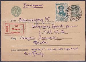 Дополнительно франкирован маркой 20 коп. сине-зелёная А.С.Пушкин № 537Д - простая бумага. Перф. Греб. 12 1/2 : 12.