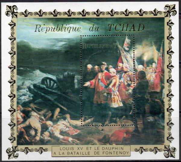 75 fr. Людовик XV и Дофин на поле боя при Фонтенуа. Почтовый Блок.