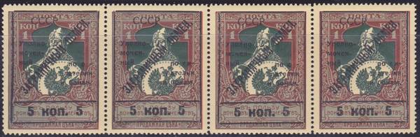 5 коп. "Заграничный Обмен ...": Дефекты в надпечатке. Штрайф из 4-х марок.