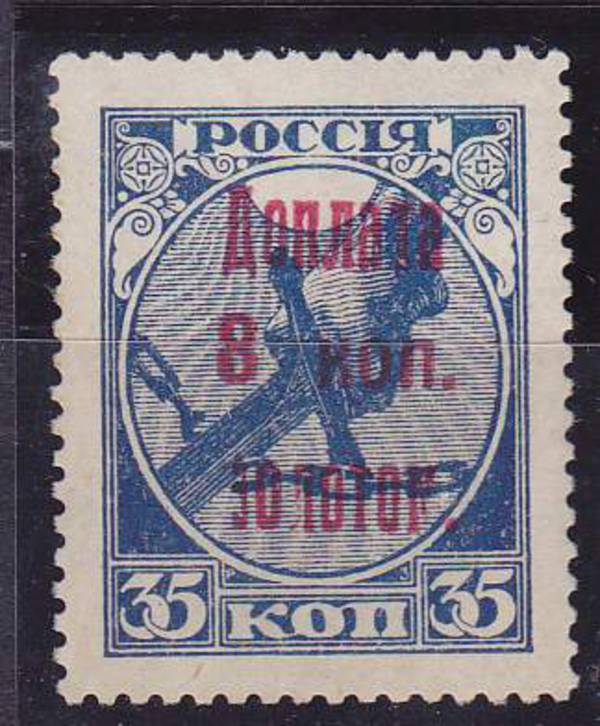 Карминовая типографская надпечатка "8" на 35 коп. Разбиты буквы "Л" и "М" в слове "ЗОЛОТОМ". С зубцами.