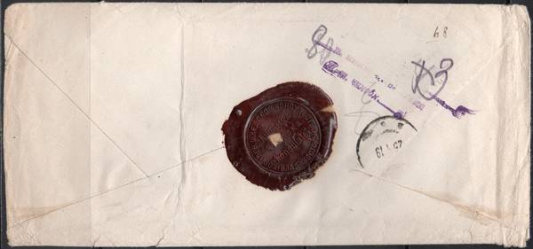 Штемпель оптравления: "Владивосток 19..04.1919 т * * ". На обороте фиолетовый штемпель "__к. взыскано деньгами П.-т. чиновн._____". От руки вписано 80 и стоит подпись. Штемпель прибытия 25.04.1919. ( город ЧИТА - не пропечатан ). Сургучная печать Шведского Консульства. |