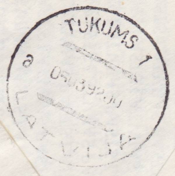 Штемпельный конверт Латвии допольнительно франкирован двумя марками Латвии и маркой СССР № 6374. На обороте штемпель прибытия Тукума. |
