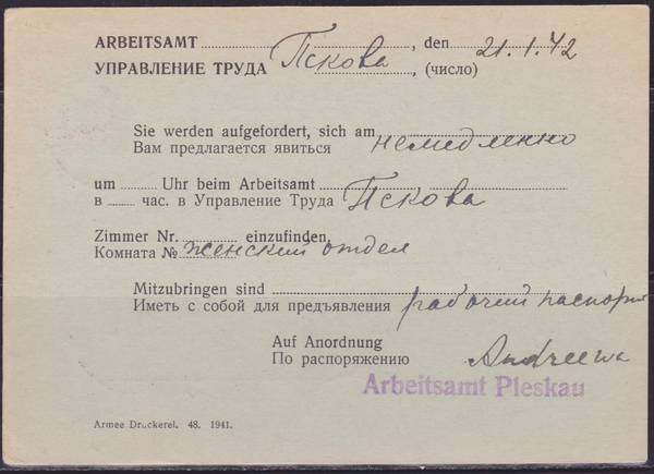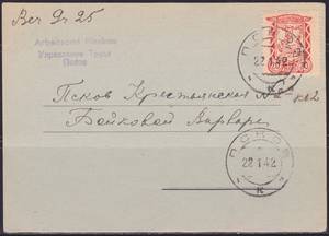 Штемпель " Псков 22.01.1942 * к * ". Почтовое Отправление ( Повестка на работу ) франкировано маркой Немецкой оккупации Пскова 1942 года - № 11 - 20 коп. красно-коричневая. Герб города Пскова. |