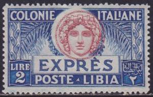2 Lire. Голубая / Красная. " ESPRESSO POSTE LIBIA ". 1 марка.